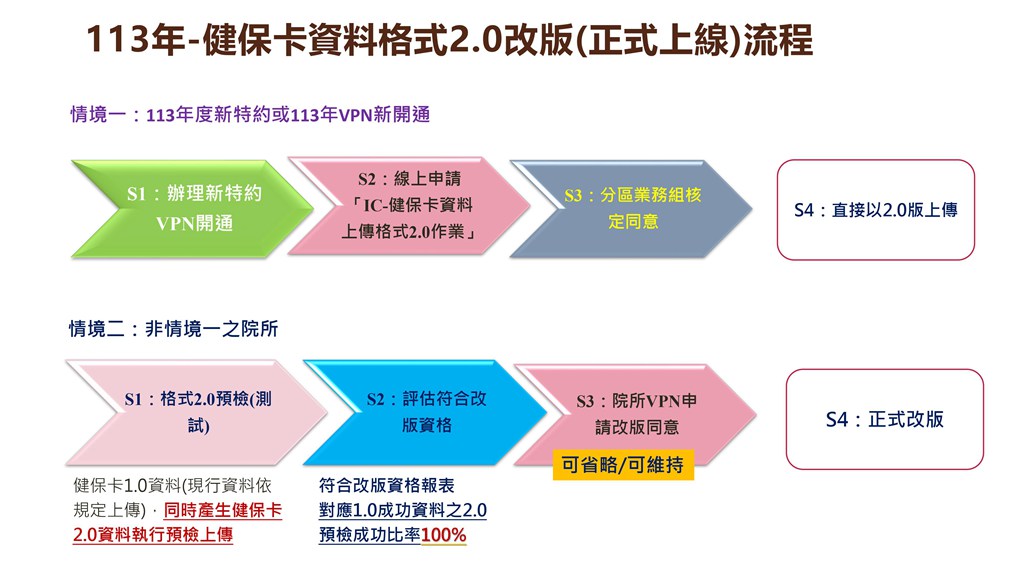 (1)情境一:113年度新特約或113年VPN新開通之特約醫事服務機構(下稱院所),於本署健保資訊網服務系統(VPN)申請試辦計畫項目「IC-健保卡資料上傳格式2.0作業」(下稱IC試辦計畫),並由分區業務組核定同意後,可直接以健保卡2.0格式上傳每日就醫資料。